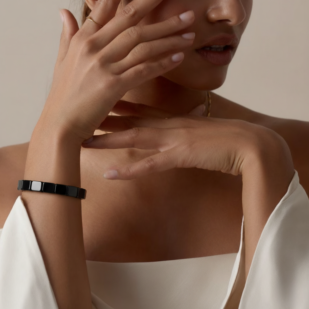 Disconnect from noise and stress. Embrace a natural and elegant way to restore balance to your mind and body. The Omyra bracelet is crafted from genuine polished hematite, known for its grounding and stabilising energy. Its smooth, sculpted design creates a refined feel that rests comfortably on your wrist. A timeless piece that helps you pause, breathe, and feel centred every day.